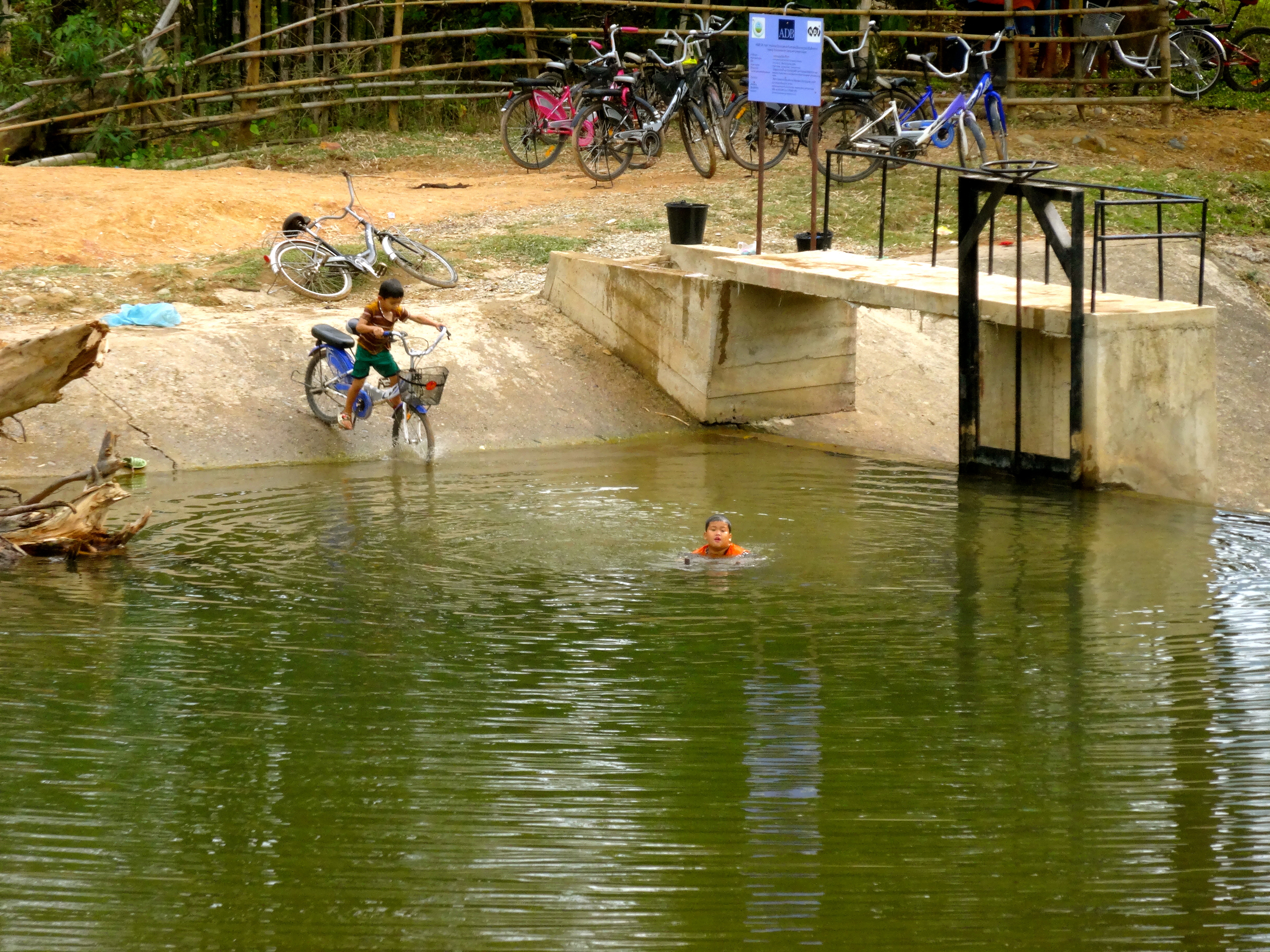 These kids ride their bikes right into the river … both they and the bike get a bath.