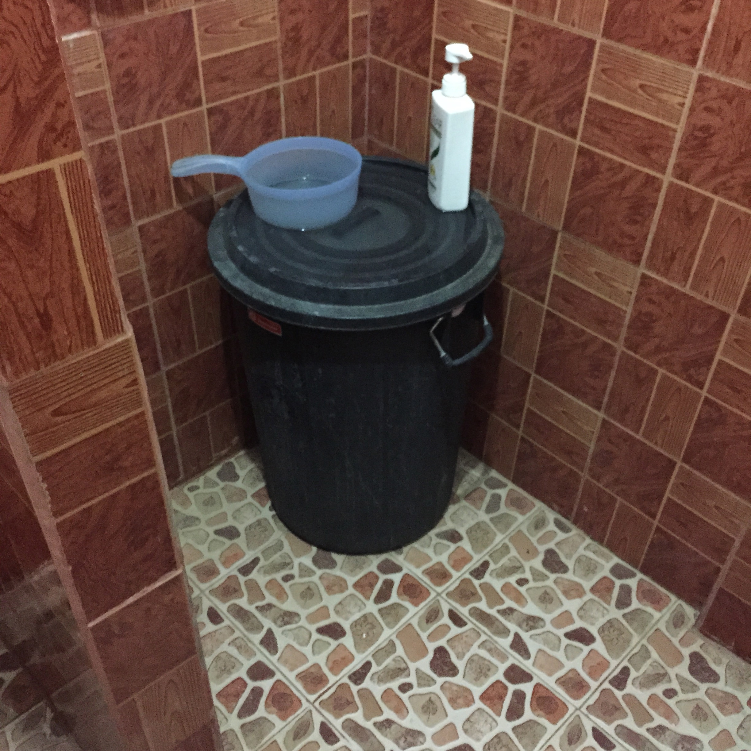 there was no water. Remember those black trashcans in the shower that I mentioned in Shades of Culture Shock and found so curious? Well, they’re full of water for times like these. I opened the lid, dipped the large plastic scoop into the cold water, and poured it over me. The cold water is refreshing but the first splash is always a shock to the system. I poured another scoop over me, lathered up with soap and then took a few more scoops full of water to wash off. It’s not ideal, but works well enough.