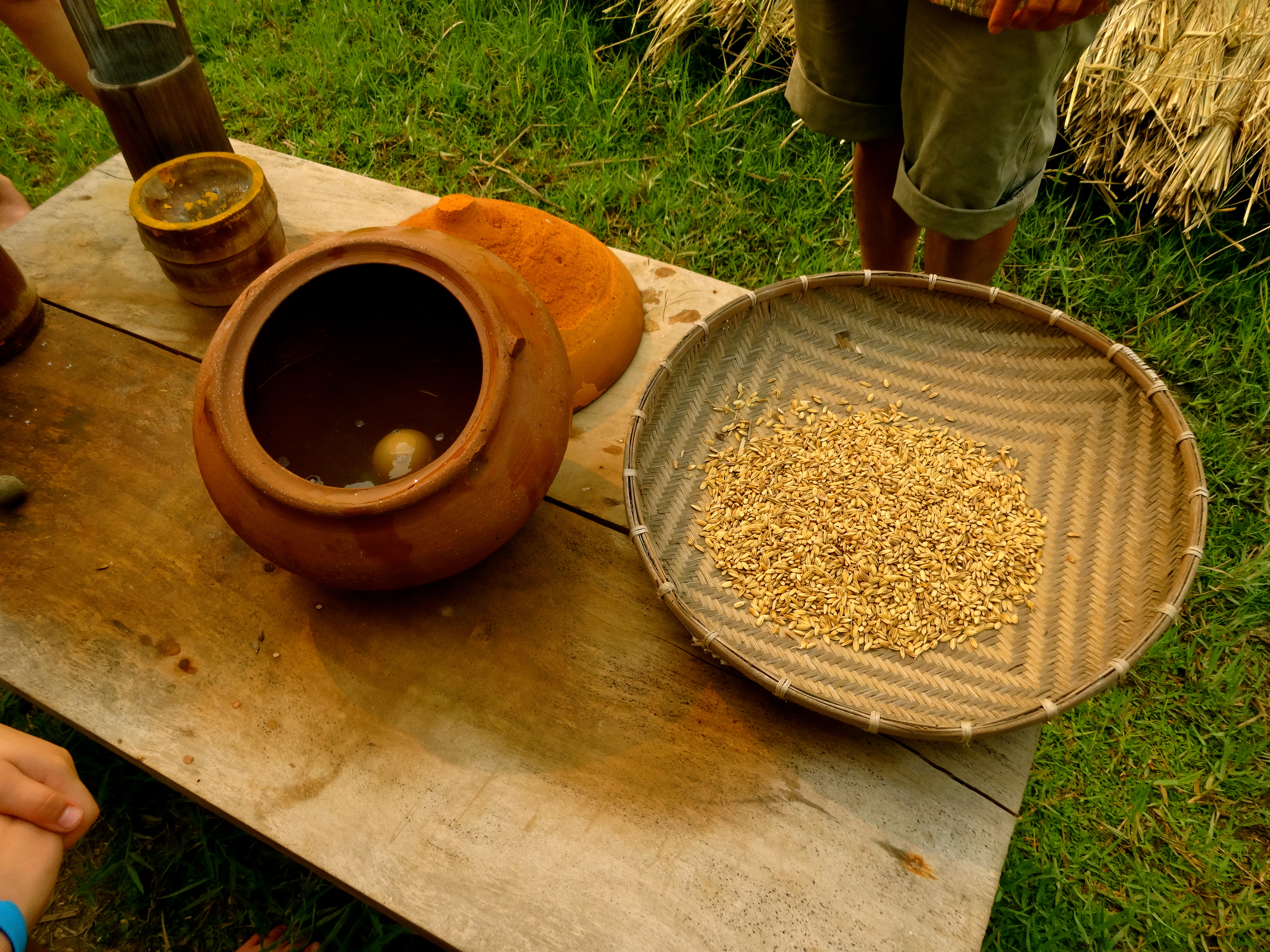 The Living Land farm is located about 5 kilometers outside of town and the tour offers a 14-step education on sticky rice, from seed to table. The farm is beautiful with rows of green vegetables, pristine thatched roof houses, and several plots of rice. When I arrived, I joined a group of 9 other people and met Laut Lee, the Director of the farm. He started the morning with a cheerful introduction, quickly memorized everyone’s name in the group, and showed us the tools that we would be using that day. After introductions, we were off to start our steps and learn about sticky rice, which as it turns out, is sticky due to the glutinous varietal, and not due to the cooking process.