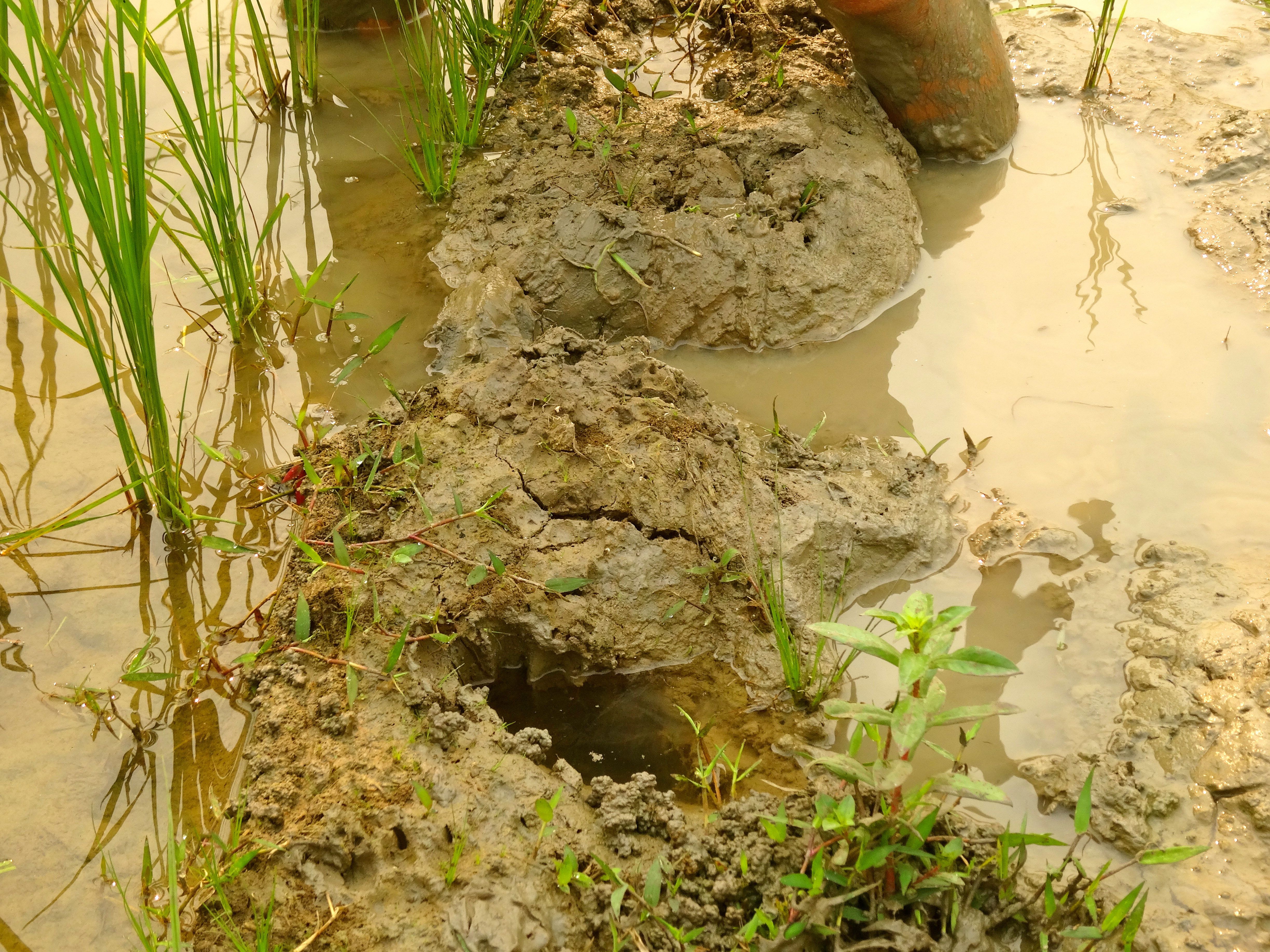 Step #5: Irrigation and Weeding. It’s important for the rice paddy field to stay wet. In order to do this, Lee has built irrigation channels that bring fresh water down from a mountain stream, and irrigation is done quite simply by shifting the mud at the edge of a paddy to allow more water into one paddy from another. Weeding also occurs quite easily because the mud is so wet, and weeds can either be pulled up or stamped down into the mud and suffocated. Lee does a combination of both because he likes keeping some organic matter in the soil to make it rich with nutrients.