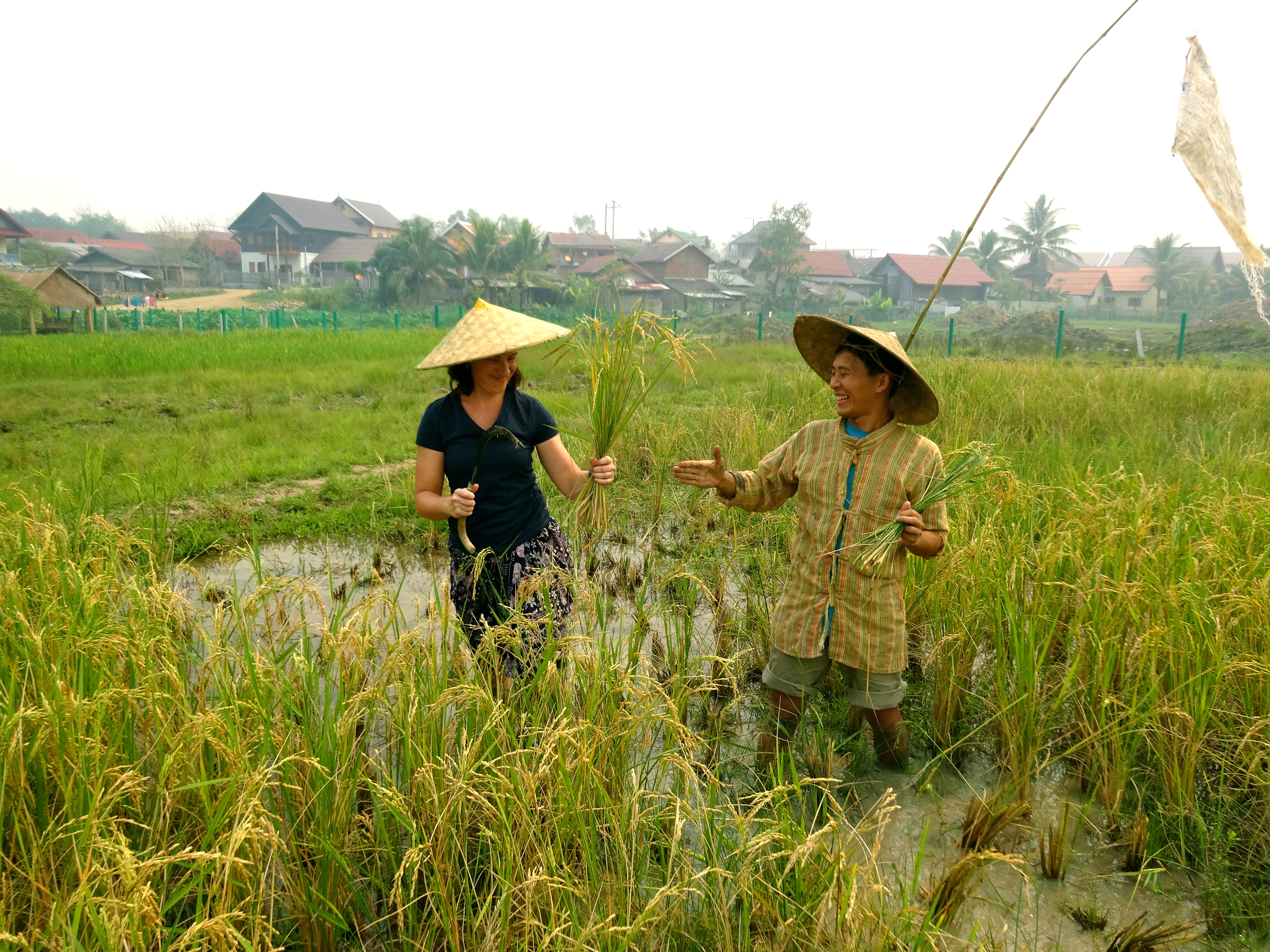 I stepped off the bus in Luang Prabang and hopped into a tuk-tuk to get to the lodge that I had booked for my short 3-night stay. Driving through the town, I instantly had an affinity for the streets humming with people, the stands brimming with fresh fruits and vegetables, and all of the street vendors. My lodge was just off the street where the morning market is set up and a block from the night market, so I was surrounded by colorful wares and delicious smelling food. When I checked into my lodge, the desk manager asked if there were any tours that I wanted to do while I was there. Since my time was so short, I hadn’t planned anything, but asked him to recommend the best one tour. “The Living Land”, he said.  It was a tour of a sticky rice farm. I thought, I’ve been eating sticky rice with almost every meal for the past three weeks… it would be good to know a little more about what I’ve been ingesting. It seemed that my time on a farm was not over yet after all.