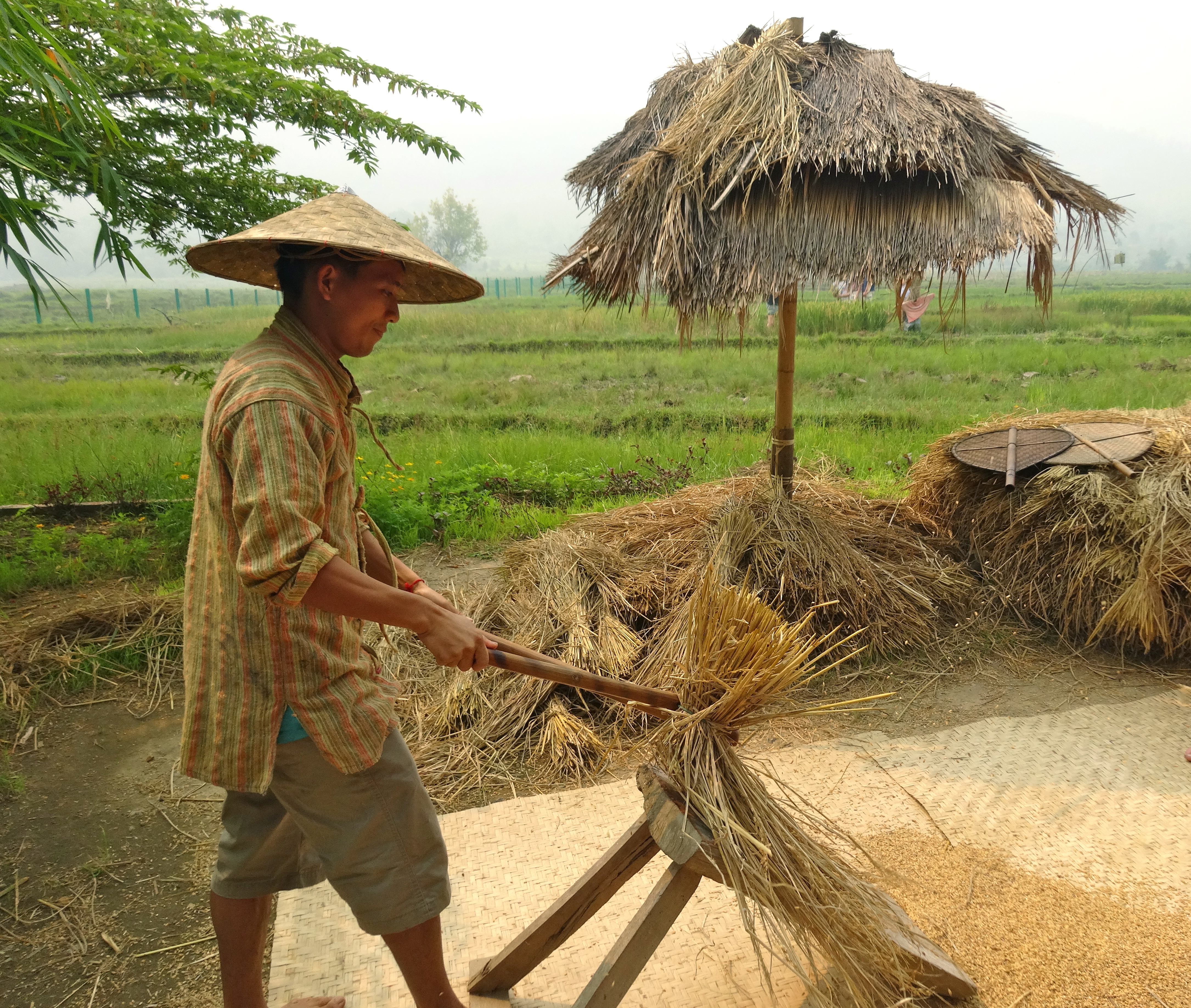 Step #7: Threshing. Once the bundles are dry, they are gathered from the field. Threshing involves separating the rice grain from the stalk, and basically requires beating the stalk against a wooden board until all of the rice falls off. This seems like a great form of exercise when one needs to let out some aggression after a bad day!