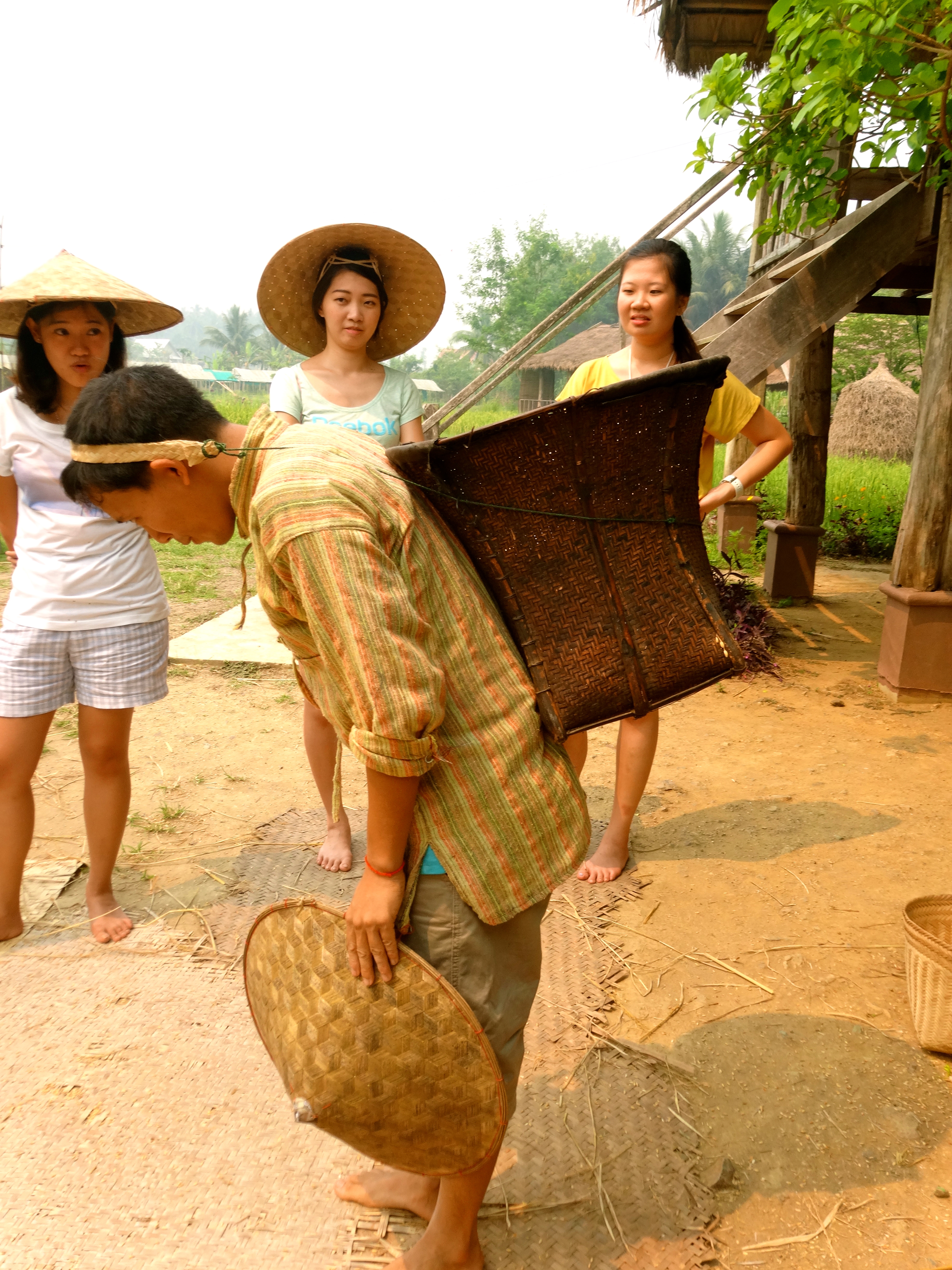 Step #9: Transport. There are many different baskets for carrying the rice… an over the shoulder long wooden carrier with a basket on each end, a simple basket strapped to the shoulders, or the most difficult one, which is a single strap that gets strapped around the forehead. I’ve seen men, women and children carrying baskets like this and can’t believe how heavy the baskets are. There is clearly a technique to this method of carrying that is learned from a young age. My neck and head would be killing me!!