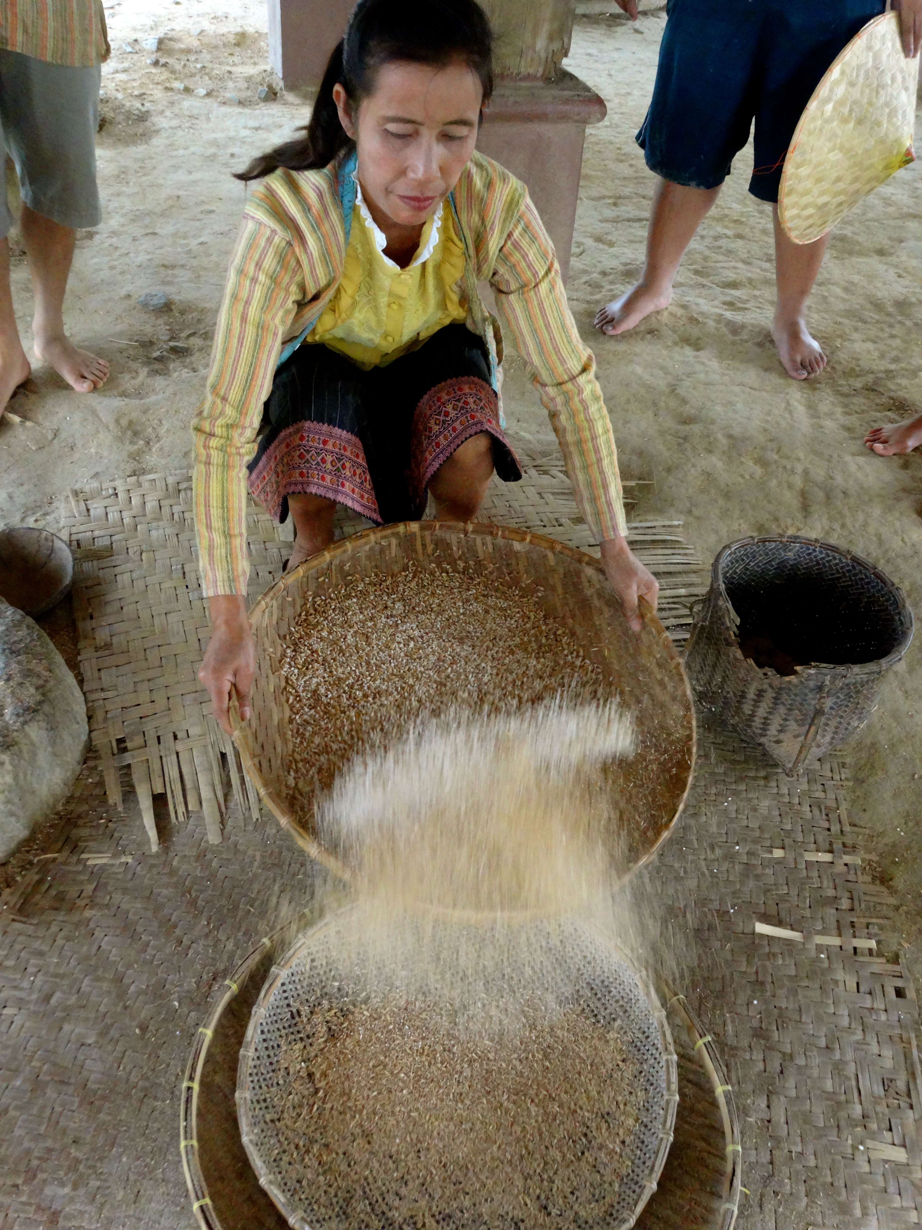 Step #11: Separating the shelled rice. This process is done typically by women who have honed the technique of tossing the rice into the air over a woven circular platter. As the rice falls, the shells are blown off the platter. The woman who showed us this technique also swirled the rice around the platter, which forced all of the sturdy white grains to the center and pushed all of the empty shells to the outside so that she was able to scoop up the grains in the middle. Lee explains that if a woman cannot master this technique, it is unlikely that she will find a husband. On average, the people of Lao each eat about 20 kilos (44 lbs.!) of rice per month, so it’s easy to understand why this is important! Lee complimented me on performing this separating technique quite well for my first try and encouraged me to stay and try to find a husband there… hmmm.