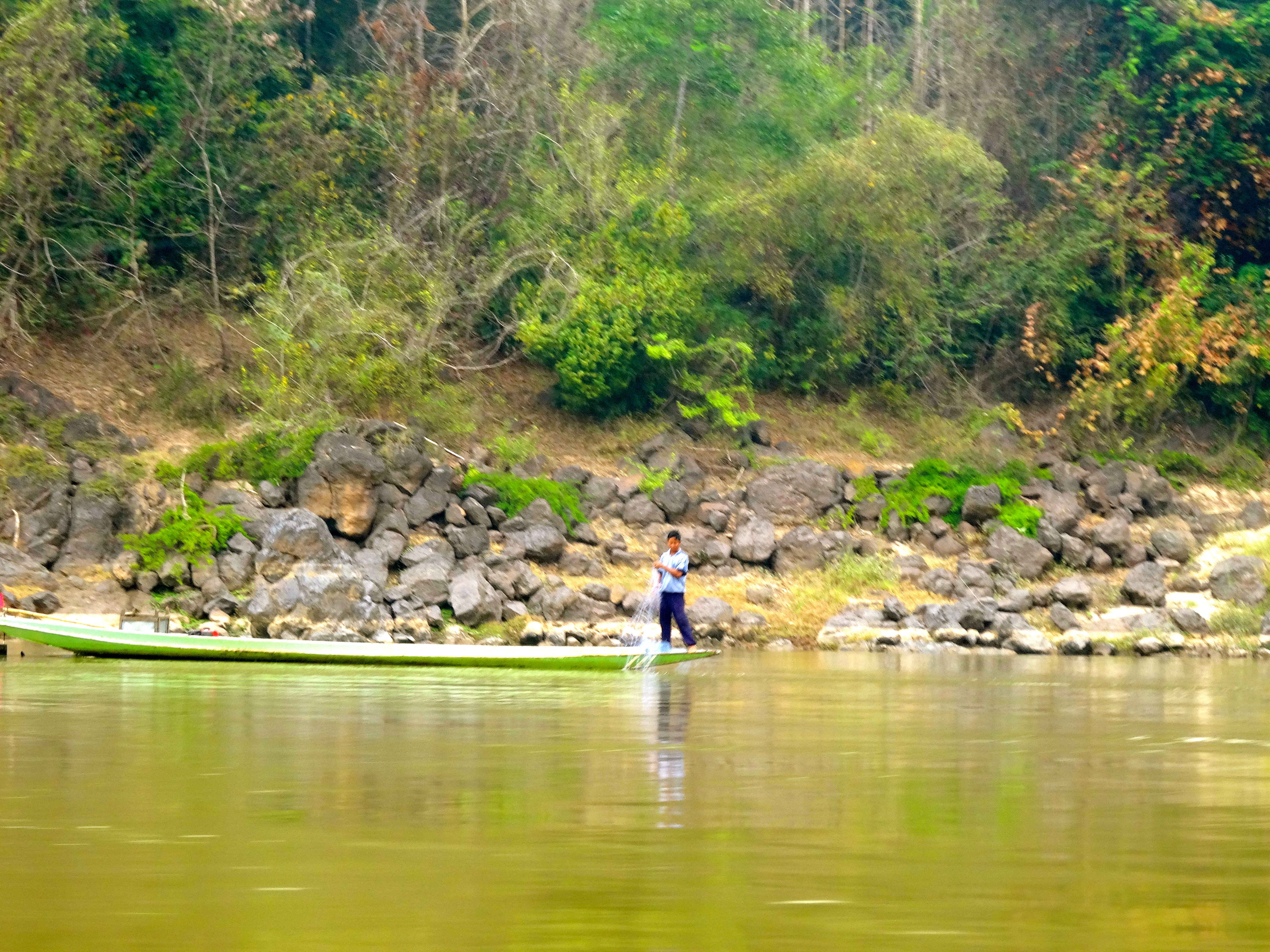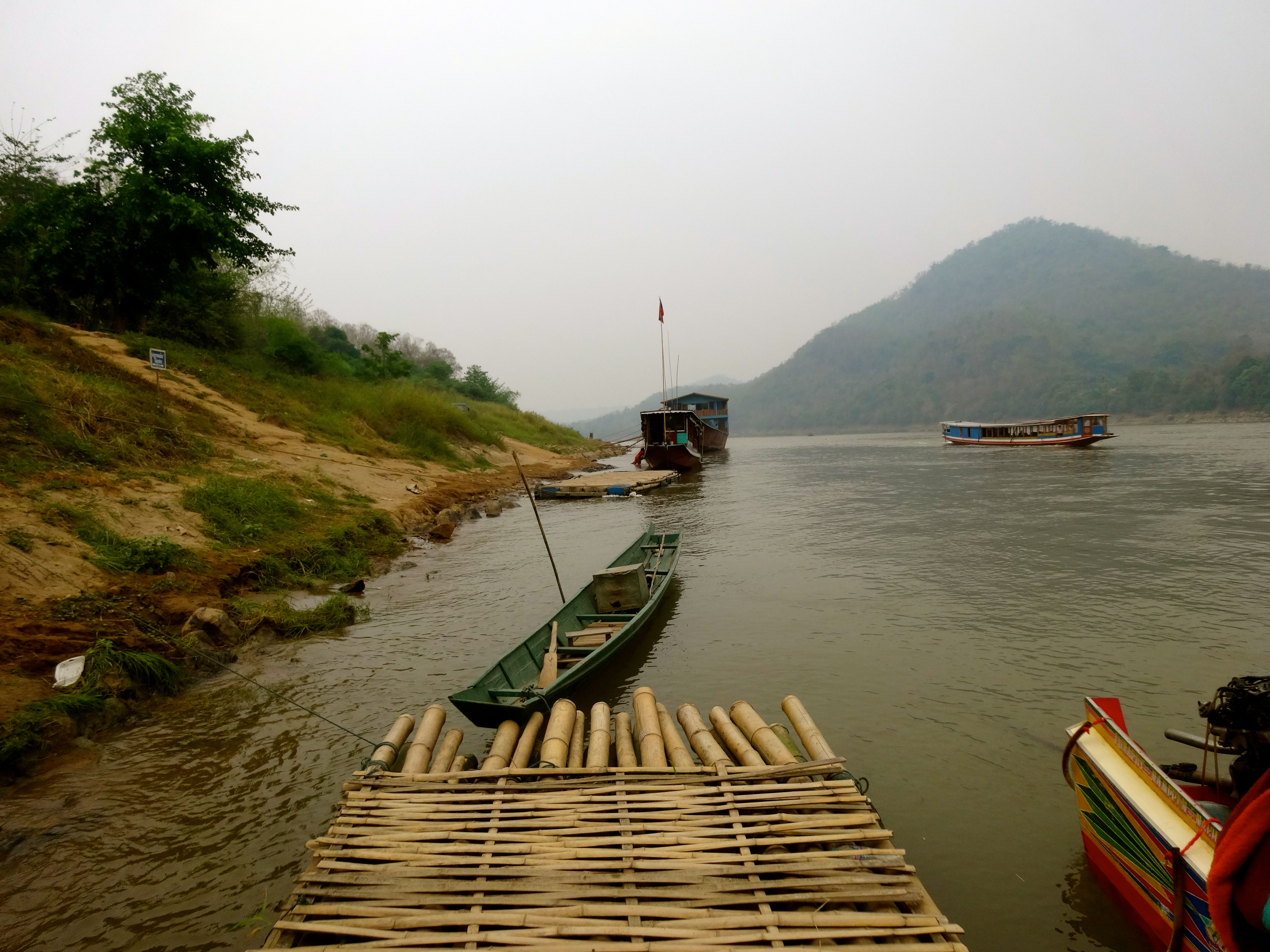 slender Lao women, who seemed to assume this sitting position so easily. Thankfully, about 75 minutes into our trip, we pulled up to another boat along the shore that was a floating fuel station. It gave me a chance to stand up for a moment and stretch my legs. Everyone looked at me as if I was being a little dramatic. Five minutes later, we were off again. Two hours into the ride, we stopped again to let someone off at another floating boat, which seemed to be someone’s floating house, and we all got out to use the toilet. The fast boat didn’t seem to have specific ports of debarkation… it seemed more like a river taxi and the simplest way for people to get to their remote villages. As we headed into hour three, my knees were practically numb and I had shooting pains from my hips into my lower back every time that we went over choppy, bumpy water. It turned out that the life jacket was far better utilized as a cushion for my spine against the hard wooden plank than as a life-saving device.  I mean, really, was that life jacket going to save me if we hit a rock and I went flying out of the boat?? I don’t think so. Oh yeah, and the woman sitting next to me was sleeping in her seated, curled, upright position!?