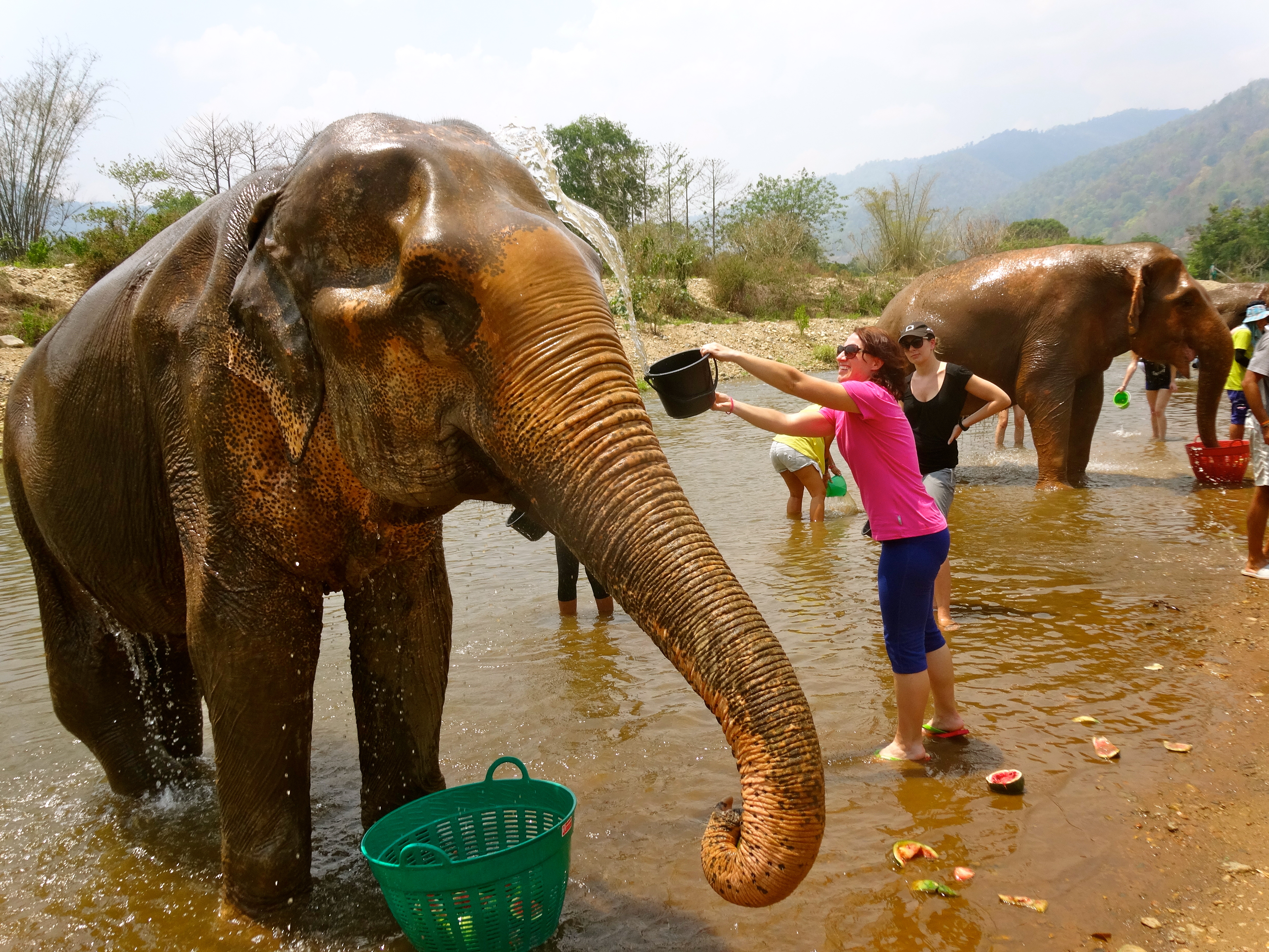 during one of the last attempts, her hips and back legs were dislocated due to the weight of the bull.  Most elephants, especially male elephants, weigh in the neighborhood of three to four tons. Their penises are 1.5 to 2 meters in length and their mating ritual only lasts about 2 minutes, in part because it takes a lot of energy for a male to pump enough blood into a 2 meter long penis to be effective, and also in part due to the fact that a female can’t support the weight of the male for very long.  So, when poor Bualoy was tied up with no escape and repeated attempts were made to breed, she was physically and emotionally damaged. Her back no longer has the characteristic curve in it, her hip was broken, and one of her knees is permanently dislocated so she walks with a limp. Unfortunately, elephants also have a very good memory, so who knows with what sensibilities Bualoy lives on a daily basis. We gave her some extra special attention, scooping up water and throwing it on her back. Our guide told us that bathing like this was like a gentle massage for the elephants, so we went to work. Bualoy stood there munching on watermelon and contently flapping her ears while we washed her down.
