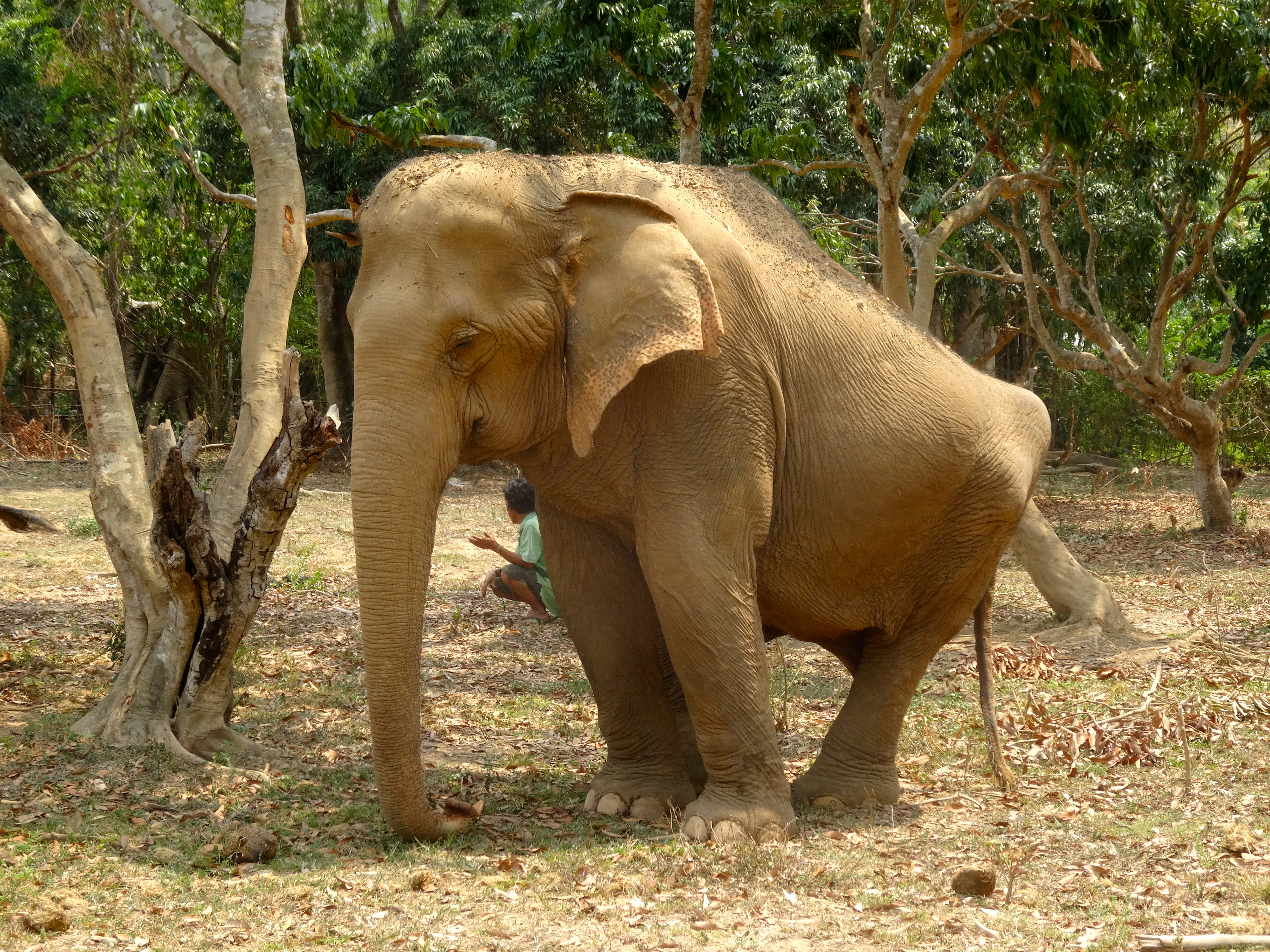 assigned to one elephant, and spend the majority of their day watching over that elephant no matter where it goes.   They work with the natural instincts of the elephants and carry bags of food to help reinforce good behavior. Their relationships with the elephants, which we witnessed while there, were remarkable. They develop a long-term bond and deep trust with the elephant, something that can only be achieved over a long period of time. At ENP, when one of the mahouts had to leave due to family issues, his elephant moped around for weeks. They tried to introduce another mahout to the elephant but it took several different introductions of various mahouts until they finally found a man with a similar disposition to that of the elephant who the elephant accepted. And it is only now, after about six months time, that the elephant has started to seem content again, as witnessed through all of its ear flapping, which is a sign that it is happy.