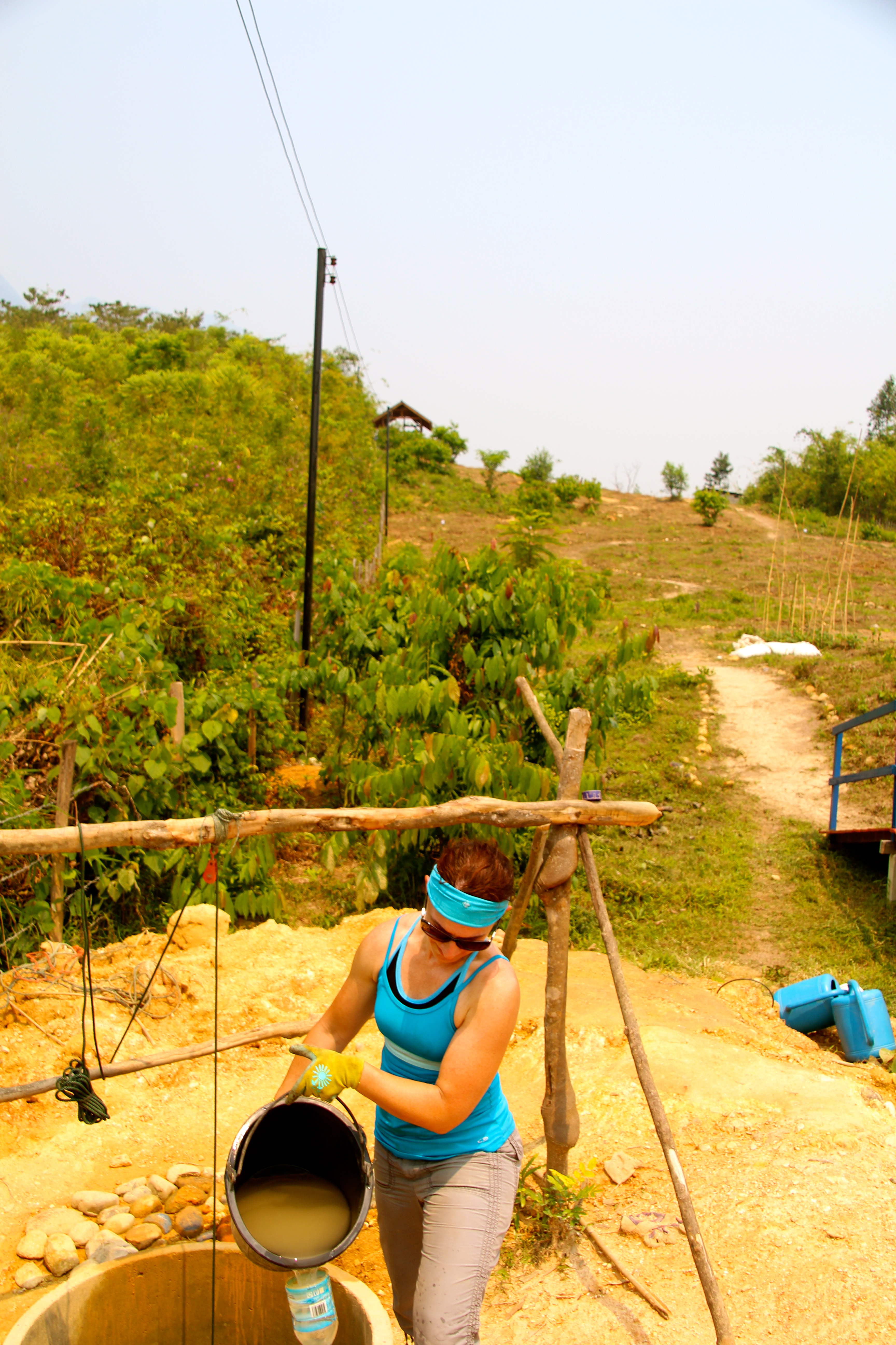 used as the toilet. Sai, our program manager, weed whacked nearly the entire lot. We made labels in both English and Lao to post next to our plants and trees, weeded vegetable beds, cleared out branches, laid stones around our muddy well, and transplanted papaya trees. Every night, Sanne and I went back to the house and researched how best to care for a specific plant or tree, how to test the soil, what to use as fertilizer, or how to build a compost bin in order to relay the information to Sai or offer suggestions. We also sanded and started painting our hut, which offers the only shade in the garden and is where we eat our lunch everyday. And, of course, there was always the watering, every day, twice a day.