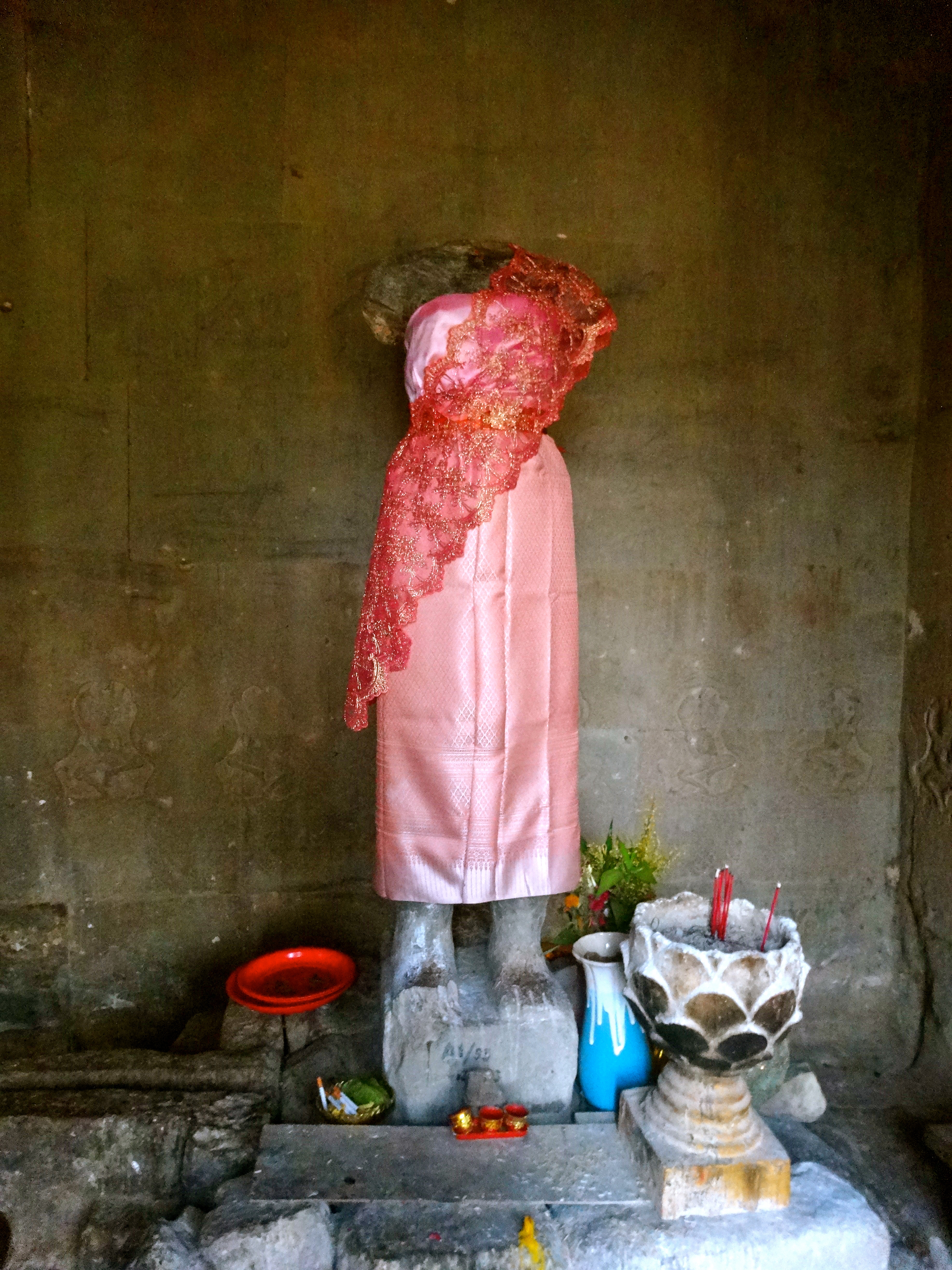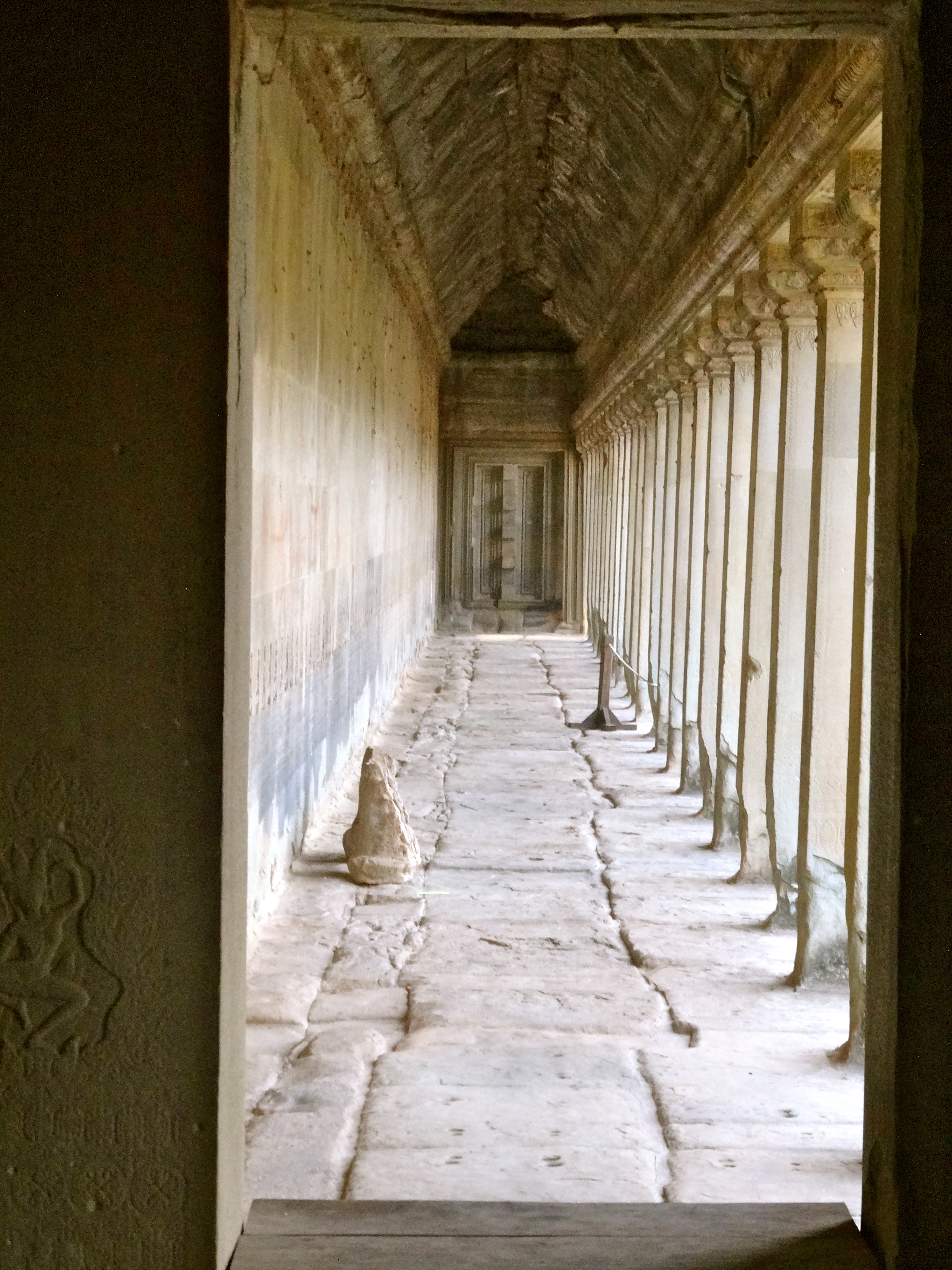 imagining characters walking down the long corridors of pillars, and trying to fathom what it must have been like living in the time that it was built. This temple has transitioned from a Hindu temple to a Buddhist one, as rulers changed reign over the years. It went through war after war during which the heads of statues have been cut off and sold.