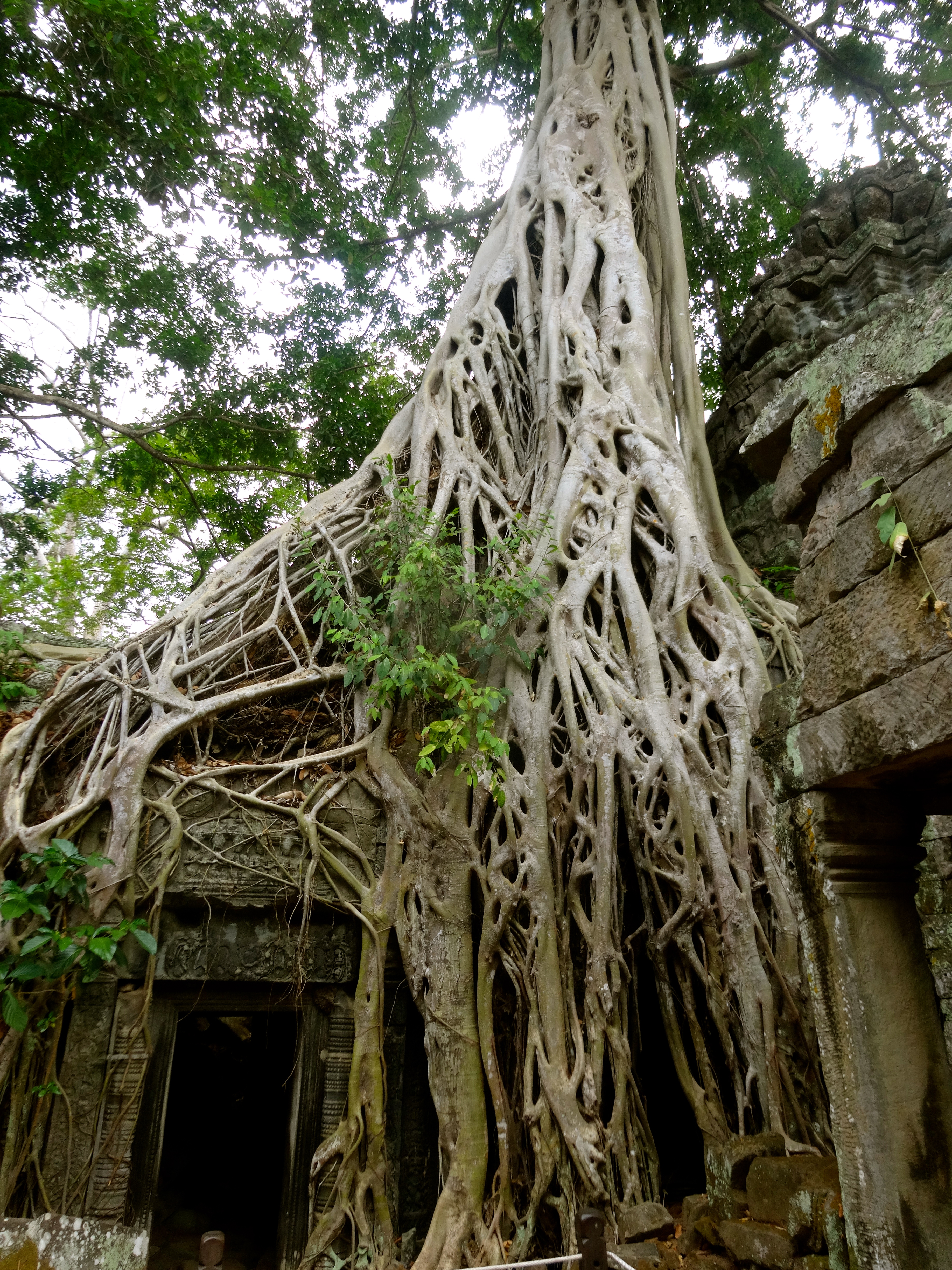 Prohm. This 9th Century Temple has been made famous due to its appearance in the movie, Lara Croft: Tomb Raider with Angelina Jolie, and has worthily earned its recognition. It was adorned with enormous trees whose roots offered just as much intricacy to the adornment of the temple as the stone etchings themselves. Nature and manmade construction had merged as one.