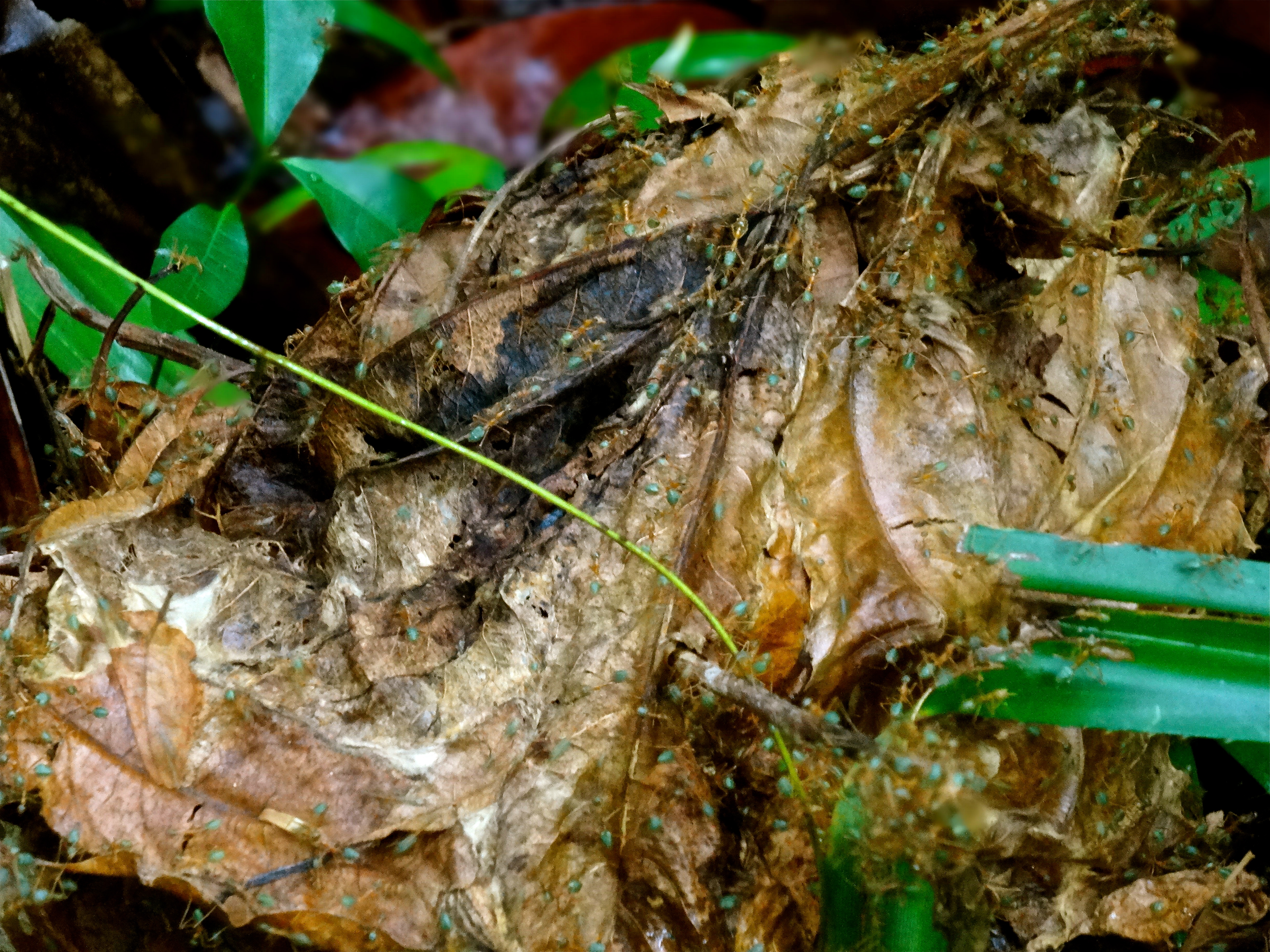 Our final lesson of the day… the green ant. It’s formal name is the Weaver ant and it is eaten not only by Australia’s aboriginal people but also by populations in parts of Asia and China because it is high in protein and fatty acids. It’s gaster, or posterior portion, is bright green and contains formic acid. Normally, the ant defends its nest by pinching and then spraying formic acid to make the pinch sting. However, if you stir up a nest, gather a handful of these ants, and then mash them together quickly before they pinch your hands, they will release all that formic acid and it has a lemony-lime smell that the Aboriginals often used for medicinal purposes to clear the sinuses. Linc insisted that if we ate it, it would taste a little bit like lemon or lime. My adventurous nature tends to fade quickly when it comes to eating insects but Linc was insisting, so before I could think about it, he gave me one to try. I think it tastes like lime!! I don’t know that I’ll go around scooping them up whenever I see them, but I guess if I’m ever stranded in the rainforest, I’ll know what I can have for breakfast.
