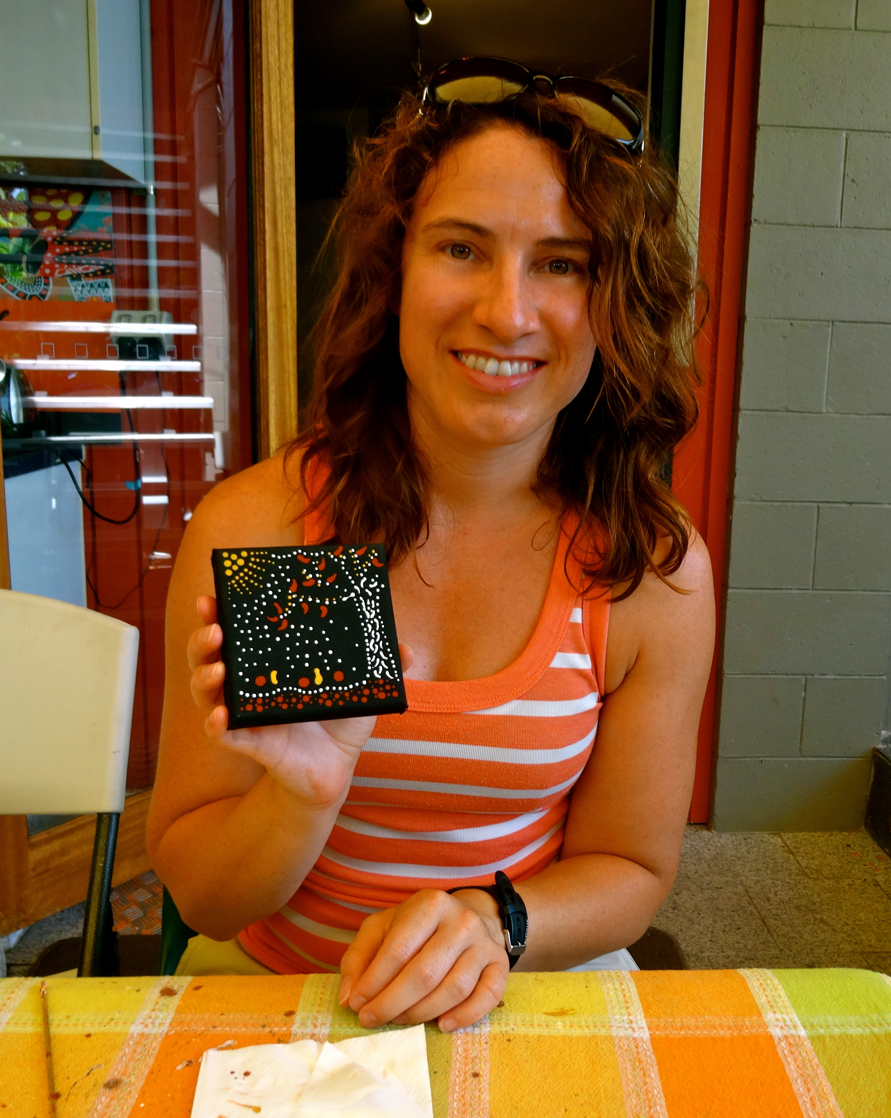 The day started at the Brian Swindley Gallery in Mossman. Brian goes by “Binna”, and his gallery is also his home. Binna is passionate about sharing the Kuku Yalanji way of life so that it is never forgotten and he does so by telling stories through his artwork. Binna was born with a severe hearing disability that he has overcome by learning to speak and lip read and he has been communicating through his painting for over 20 years. When our group arrived at his gallery, we were welcomed with Binna’s giant smile and great sense of humor. Binna explained that before his people had language, they communicated through art, and the art told stories about the land and the animals. The colors used are typically an earthy red to represent the land, a mustard yellow to represent the sun, and white to represent water. The artwork is often painted using sticks and creating variations of dots and lines. Once he taught our group about some of the symbolism of the paint colors and how to create the patterns, he asked us all to paint something that we had seen when we walked through the rainforest. As I looked around the table, I could see everyone thinking hard about what they should attempt to paint and how to do it. I, myself, found that painting by using a pattern of dots and lines was very detailed and time consuming even for the small canvas that we were given, yet Binna, who joined us and continued working on one of his own pieces, seemed to paint effortlessly. The picture in his mind was very clear. He was remarkable to watch.